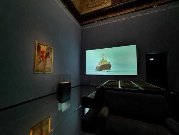 Im abgedunkelten Saal der Stille leuchten die Bilder in zweifacher Form: real von den Wänden und im Bodenspiegel. Es ist die Stille des Staunens, der Ehrfurcht vor der Größe des/der Genies. Magie erstrahlt und lässt jeden verstummen vor der Wucht des Eindrucks, wie aus Dunkel das Helle der Werke hervorstrahlt: Der machtvolle Prometheus, der Feuerbringer, der Menschenermöglicher, dann die boshaften Caprichos Goyas, der ebenso an Taubheit litt wie Beethoven und ebensolche genialen Werke aus seinem Leiden heraus schuf. An der Stirnwand fährt ein Eisbrecher durch das wässrige Eis, über das ein Mensch marschiert. Er scheint mit kraftvoller Ruhe das Schiff zu ziehen. Es ist der Künstler selbst, der sich dem Risiko Tod aussetzt und dabei filmen lässt. Wie ein Schritt aus der Idee hinaus in die nüchterne Realität: das originale Hörrohr Beethovens. Sich vorzustellen, welche Qualen es ihm verursachte! In der Stille dieses Raumes bekommt der Laie eine leise Ahnung von der Wucht, die den Künstler zu seinem Schaffen zwingt.