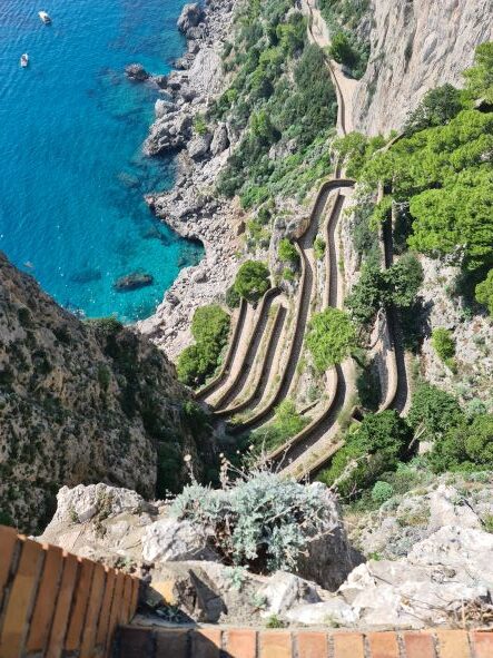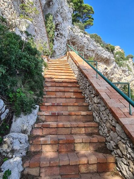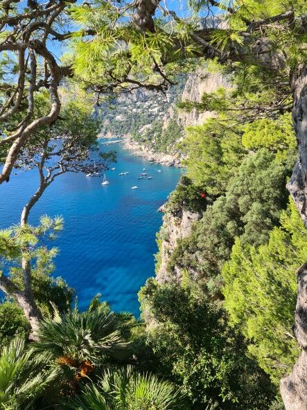 Der Arco Naturale ist ein riesiger, aus dem Wasser ragenden Felsbogen, dicht bepflanzt mit Macchia und – natürlich – Pinien! Über steile Stufen geht es hinab fast bis Meer. Dann steht man beinahe unter dem Bogen, dessen Wucht überwältigend ist. Der Ausblick über die Küste – wie kann es in Capri anders sein – capriciös!