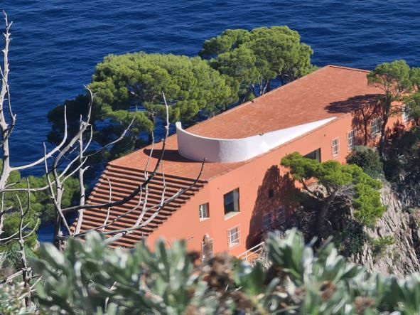 Im „Garten des Augustus“ war er ganz sicher nie – wie auch, wenn es nicht einmal gesichert ist, ob er überhaupt auf Capri war. Aber der Name lockt Touristen in Scharen an. Ab 10h morgens traben die Gruppen hinter ihren Führern her. Der Ausblick von dort oben ist – richtig erraten – spektakulär. Man schaut auf die in den Felsen eingehauenen Windungen der „Via Krupp„. Friedrich Alfred Krupp verbrachte die Winter 1898 bis 1902 regelmäßig auf Capri. Hoch oben auf dem Felsen steht seine Villa. Wozu er diese Wahnsinnsstraße bauen ließ, weiß kein Mensch. Ob er über die Serpentinen täglich hinunter ans Meer spazierte? Wohl eher nicht. Hatte er schon ein Auto, das diese steilen Kurven packte? Wohl eher nicht. Alles Spekulationen, wie ja der ganze Friedrich Alfred ein Rätsel ist, Sagte man ihm doch Feste mit Knaben nach und mehr. Aber das ist Boulevardtratsch. Eine ähnlich architektonische Leistung ist der Bau der „Viila Malaparte“. Curzio Malaparte (1898-1957), Journalist und Schriftsteller, ließ dieses Haus von dem damaligen Stararchitekten Adalberto Libera erbauen. Über diese Villa sagte Malaparte: „una casa come me: triste, dura, severa“ (Ein Haus wie ich: traurig, hart, streng). Heute ist das Haus im Privatbesitz und kann nicht besichtigt werden. Es liegt wie ein gestrandetes Schiff auf einem Felsenvorsprung.