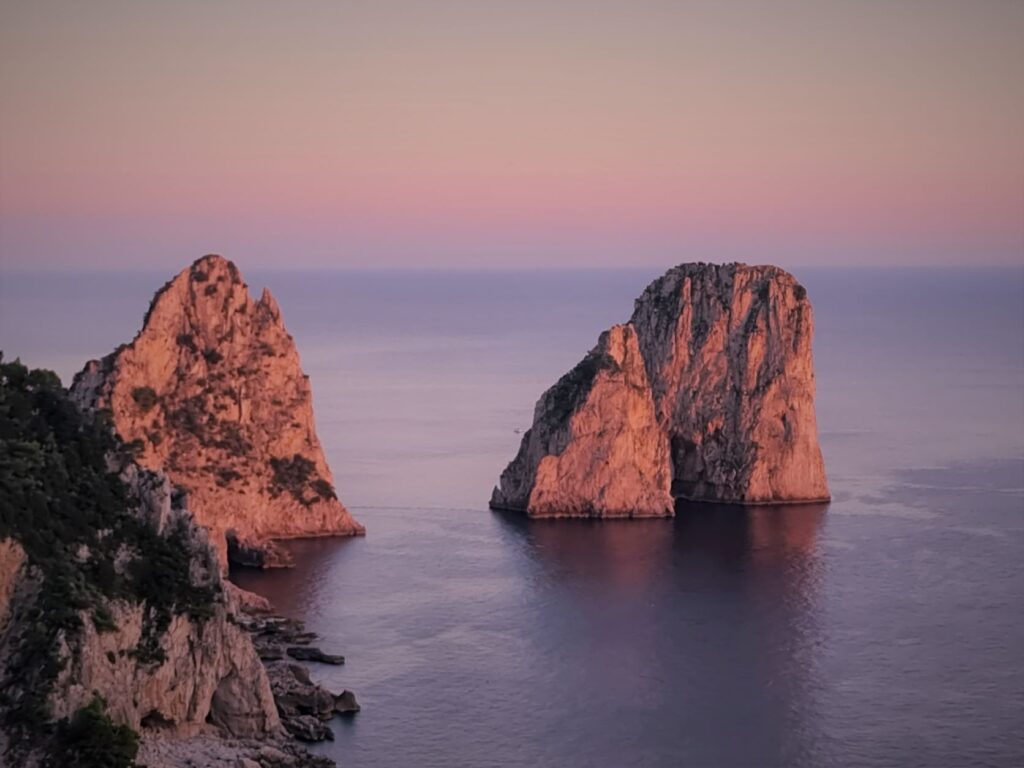 Der Abend auf der Terrasse des Hotels „Luna“ ist so ein Moment, wo vielleicht manche den Kitschalarm auslösen würden. Doch man kann süchtig auf diese Stimmung werden: Zwei Segelboote werfen ihre Anker, entzünden die Positionslichter. Es wird still. Die Sonne geht unter, färbt den Himmel in ein leichtes Lila, Rosa. Die Faraglioni leuchten gelbrot auf.