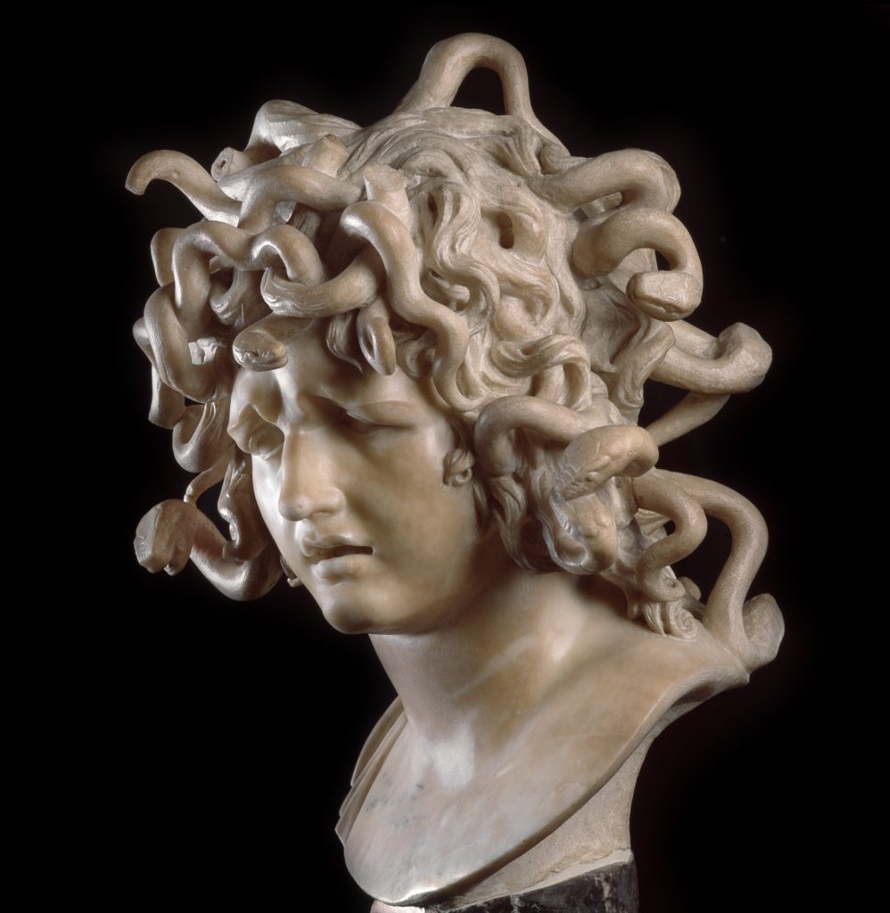 Gian Lorenzo Bernini (1598-1680) war ein weltgewandter Künstler, der seine Kontakte zur Kirche und den Fürsten geschickt auszunutzen wusste. Seine Theatralik ist subtiler als die Caravaggios. Was am Beispiel der Medusa deutlich wird: Ihr Leiden oder besser ihr Wissen um das nahende Ende (Perseus wird sie enthaupten) ist nur an dem leicht geöffneten Mund und den schmerzvoll zusammengezogenen Augenbrauen zu erahnen. Bernini war der Bildhauer der Dezenz, des Feingefühls.