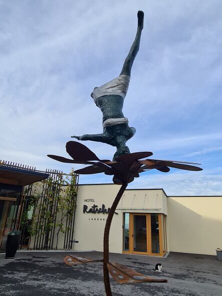 Am Morgen verabschieden mich der Kater Rombo, die beiden Muster und das Mädchen, das vor Freude am Kopf steht (Bronzefigur von Sepp Eder vor dem Hoteleingang). Welch heitere Inszenierung des Abschieds!