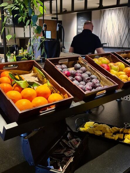 Nach einem Kurzbesuch im Fitnessraum meldet sich der Hunger! Das Frühstück spielt alle Stückeln! Verlockend die Farben: Das Gelb der Mandarinen, das Blau der Zwetschgen, das Karottengelb der Karotten, das….also eigentlich alle Farben, sogar Schwarz gibt es auf der bunten Frühstückspalette. Königlich glänzt die Schinken-Schneidemaschine. Am Rad drehend schneide ich feine Scheiben des Bauernschinken ab – eine genussvolle Tätigkeit! Was noch? Ach ja, die selbstgemachten Marmeladen und den Frizzante nicht vergessen. In Lederhose und Joppe serviert der Chef persönlich jedem ein Schnapserl!