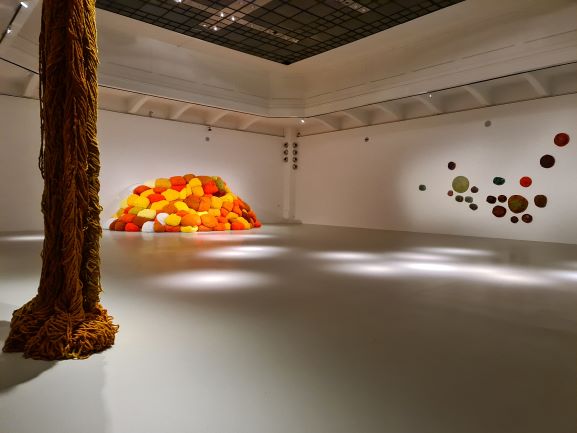 An Bäume und Wurzeln erinnern die in sich verschlungenen Seile, die ein bizarres Schattenbild an die Wand werfen. Daneben ragt wie eine Mahnsäule ein Baumrumpf aus geflochtene Garnenbis an die Decke. An der Stirnseite liegt ein Hügel aus gelb-orangefarbigen Pölstern aufgeschichtet. Vorhänge wehen vom Boden bis zur Decke. An orientalische Sitzkissen wiederum erinnern die in verschiedenen Größen und Farben gewebten Gebilde an der gegenüberliegenden Wand. Kommt man näher, eröffnet sich ein buntes Fadengewirr, als sähe man auf einen herbstlichen Waldboden. Der Interpretation sind keine Grenzen gesetzt.