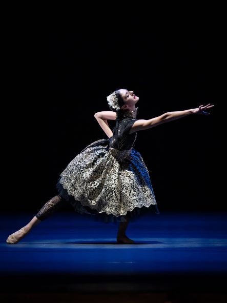 Sinn und Stilrichtung des Titels „im siebten himmel“ treffen vor allem oder eher „nur“ auf den ersten Teil des Abends zu: Wenn Martin Schläpfer ohne Angst vor Süße mit einer leichten, spritzigen Choreographie das Publikum verzaubert. Tatkräftig geholfen hat ihm dabei Susanne Bisovsky: Vor einem melancholischen Bild der Donauauen tanzen ihre heiter- witzigen Kostüme, mal in weiten Rosenröcken oder in körpernahen schwarzen Spitzen