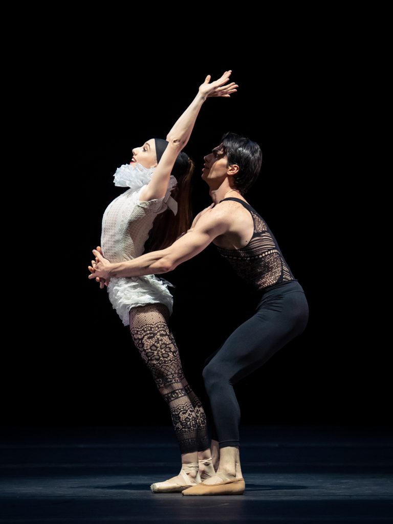 In den „Sphärenklängen“ verstärkt Schläpfer die Komik, besonders durch das Clownpaar, hervorragend unbeholfen, genial- hilflos getanzt von Fiona McGee und Cologero Falla s. Bild unten: