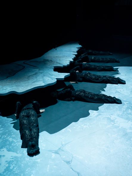 Man sieht Tänzer, die mit den Armen, Oberkörper und Kopf zucken, kreisen, rucken, zittern. Als ginge gerade die Welt unter und diese Figuren seien die letzten Überlebenden. Das zu der eindringlichen Musik Mahlers. Dazwischen hört man nur leise, fast kaum verstehbar, Wortteile aus dem Bachmanngedicht. Am Ende liegen die Tänzer bis zur Taille von den Flügeln des Vogels begraben. Ist es dieNatur, die sterbend über die Menschen sich senkt? Rätselhaft. Man bewundert die Leistung der Tänzer! Aber so mancher fragt sich – auch die Schreiberin der Zeilen – warum diese „Anti-Choreographie“? Vielleicht als Kontrast zum ersten und letzten Teil dieser Trilogie.