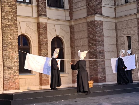 Das Stück beginnt mit dem Begräbnis des Helden. Vor der von der letzten Abendsonne beleuchteten Fassade tragen die Kameraden Athos, Porthos und Aramis den Sarg mit dem Leichnam d´Artagnans zu Grabe. Eine Reporterin mit Mikrofon versucht vergeblich, ein Interview zu bekommen. Dann folgt Schlag auf Schlag eine Szene nach der anderen, jede einzelne ein Bravourstück der Choregrafie und der Komik!!! Noch im milden Abendlicht sehen wir den Knaben d`Artagnan, den sein Vater unermüdlich im Fechten trainiert, die Mutter ihn liebevoll füttert. Aus dem Knaben wird ein junger Mann, der sich von seinen Eltern verabschiedet. Der Vater schenkt ihm den Familiendegen und das letzte Pferd aus dem Stall – eine Szene, so rührend wie komisch zugleich. Das ist überhaupt die Stärke der Inszenierung: Es darf romantisch, heldisch werden, aber immer endet jede Szene mit einem Augenzwinkern oder einer ironisch-witzigen Verdrehung der Situation. Das Publikum applaudierte oft nach einzelnen Szenen, was die Stimmung des Abends enorm hob. (Sie war immer gut, aber so eben noch mehr als gut – super!) Marcus Ganser, verantwortlich für die Details auf der Bühne, belebte die Szenerie mit komischen Details, etwa den Topfpflanzenträgern, den Schafhütern oder den Wäsche aufhängenden Nonnen.