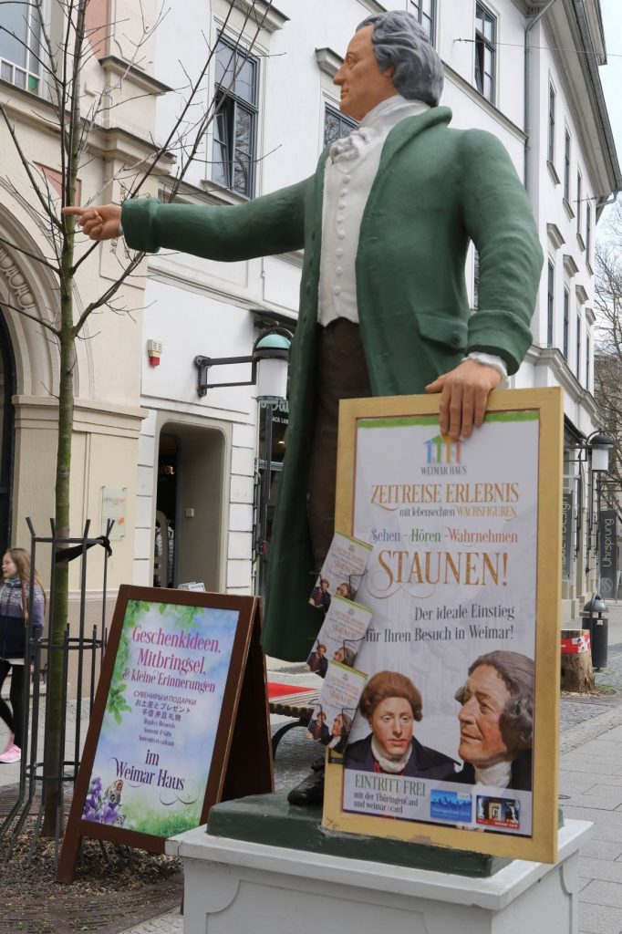 „Weimar hat Brennglasfunktion zwischen Klassik und Aufbruch in die Moderne“, erklärte Wolfgang Holler, Direktor der „Klassik Stiftung Weimar“ anlässlich der Eröffnung des Museums und trifft damit genau die ambivalente Positionierung der Stadt. Klarer Sieger nach Punkten bleibt dennoch Goethe. Er dominiert das Stadtbild: Gemeinsam mit Schiller thront er auf einem Sockel vor dem Stadttheater, ein Warenhaus trägt seinen Namen, die Auslagen der Buchhandlungen sind voll mit Werken von und über ihn, in der Auslage des Perückenmachers darf er als Toupetträger herhalten, das Theater im Gewölbe spielt fast ausschließlich Stücke „aus dem Leben Goethes oder Schillers“ und nicht zuletzt wacht das Klassikduo über den Schlaf der Gäste im schicken „Dorinthotel“. Und bei Einheimischen und Touristen ist der nach den Plänen von Goethe gestaltete Landschaftspark an der Ill noch immer Hotspot Nummer eins. Ein Aufbruch in die Moderne?