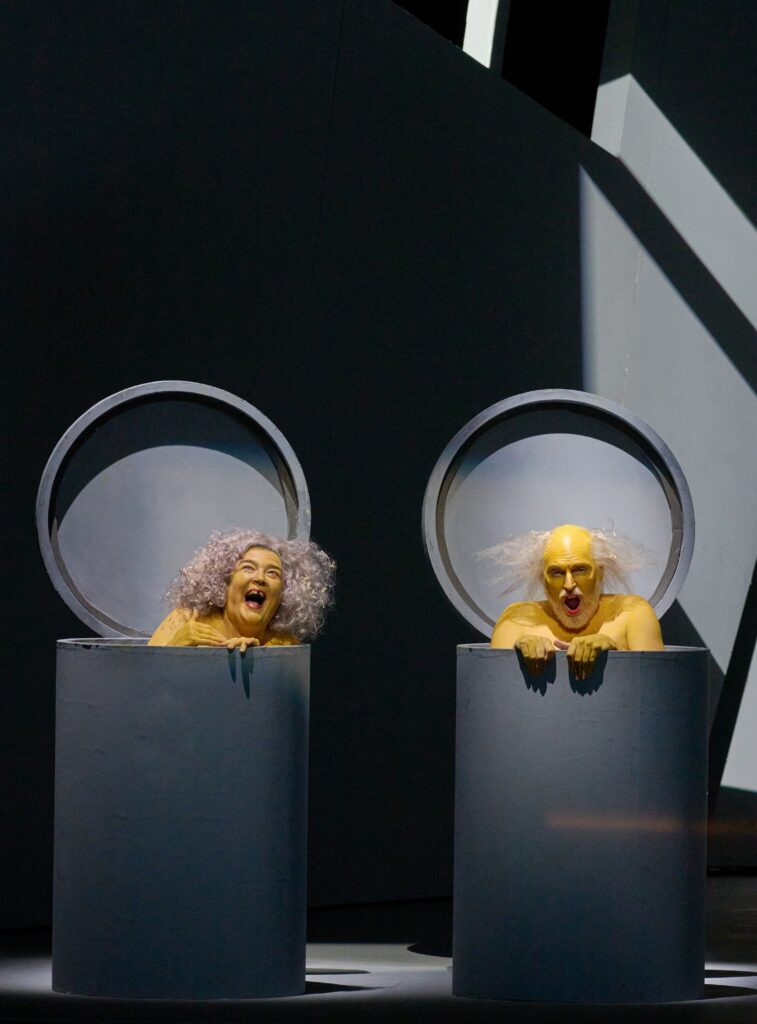 Die Eltern Hamms haben bei einem Radunfall die Beine verloren. Der mitleidlose Sohn hat sie in zwei Mülltonnen gesteckt, aus denen nur die Köpfe herausschauen. Was Charles Workman als Nagg und Hilary Summers als Nell in diesen schwierigen Rollen stimmlich und pantomimisch leisten, das grenzt ans Unglaubliche! Ihre Eheszenen, besonders die Kussszene, sind Glanzleistungen des finsteren Humors.